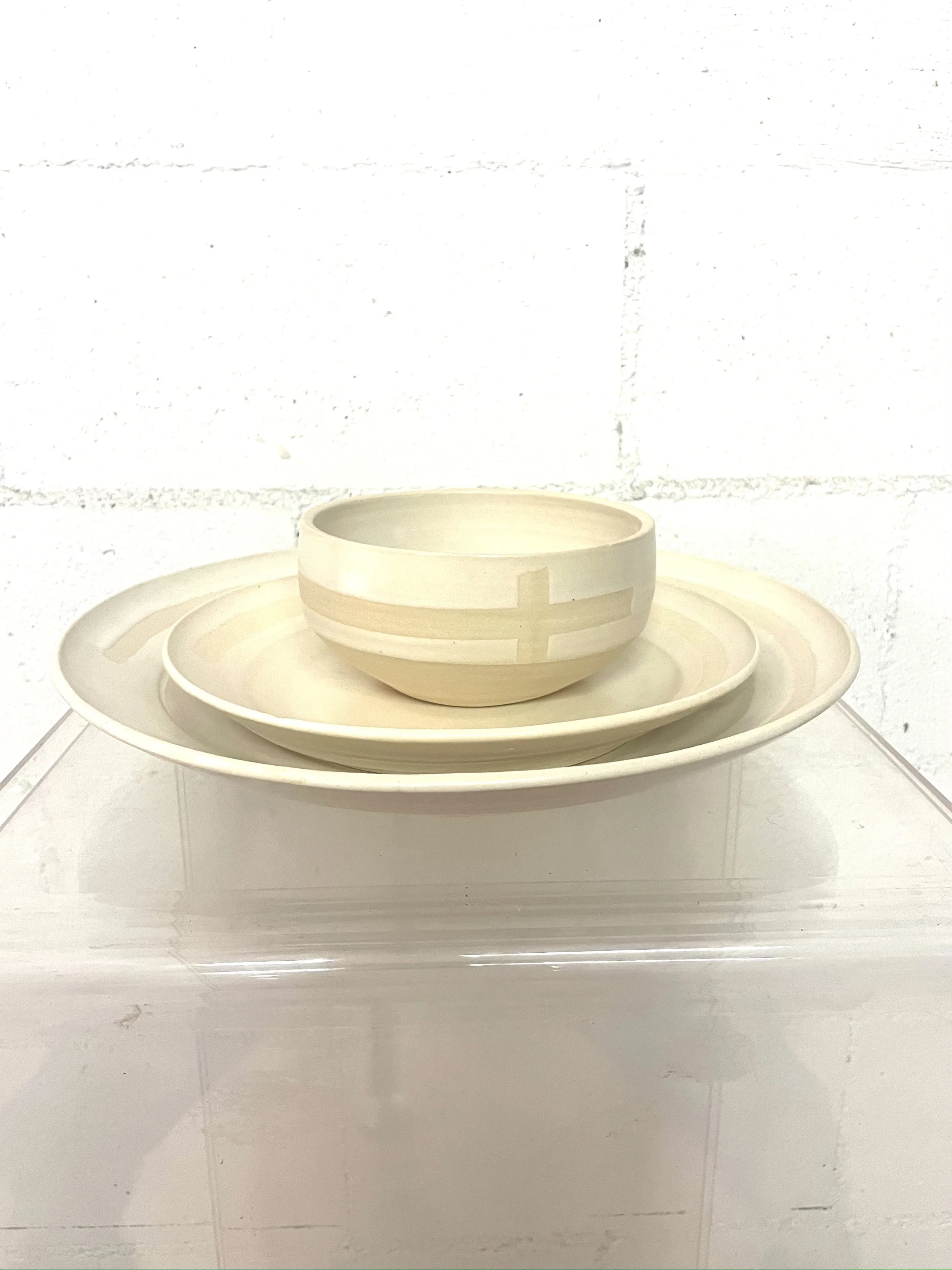 Minimal in Whites Wheel-thrown white stoneware glazed in Satin Matte White with singular, peripheral line in bare clay body. The result is contrasting whites along the rim of the plate or the exterior of the bowl.