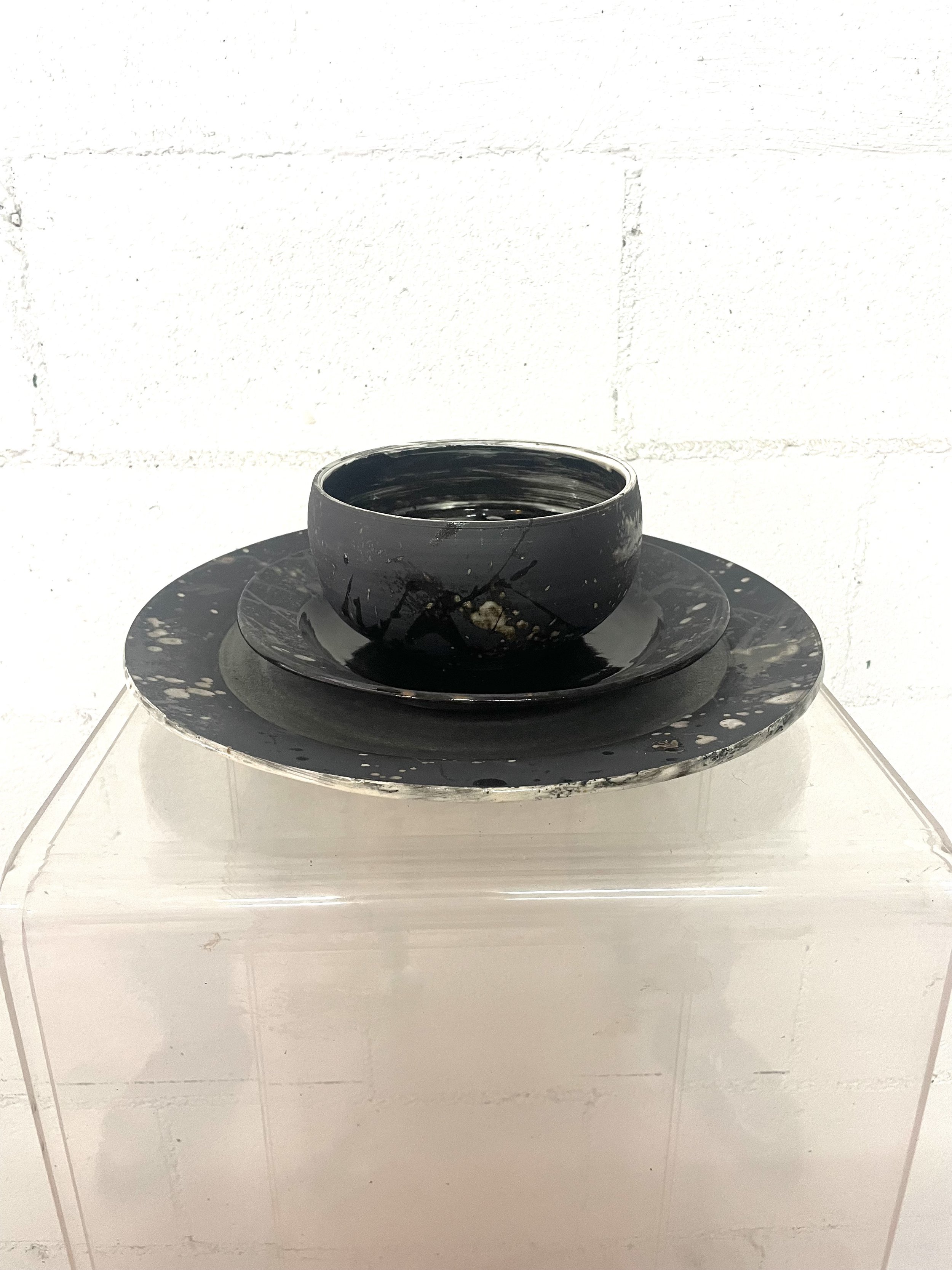 Cosmos Wheel-thrown black stoneware glazed with white slip, Bronze glaze, Clear glaze, Satin and Matte whites in a splatter technique inspired by the expressive sky of the universe. Multiple options for interior of plate: white, grey or glossy black.